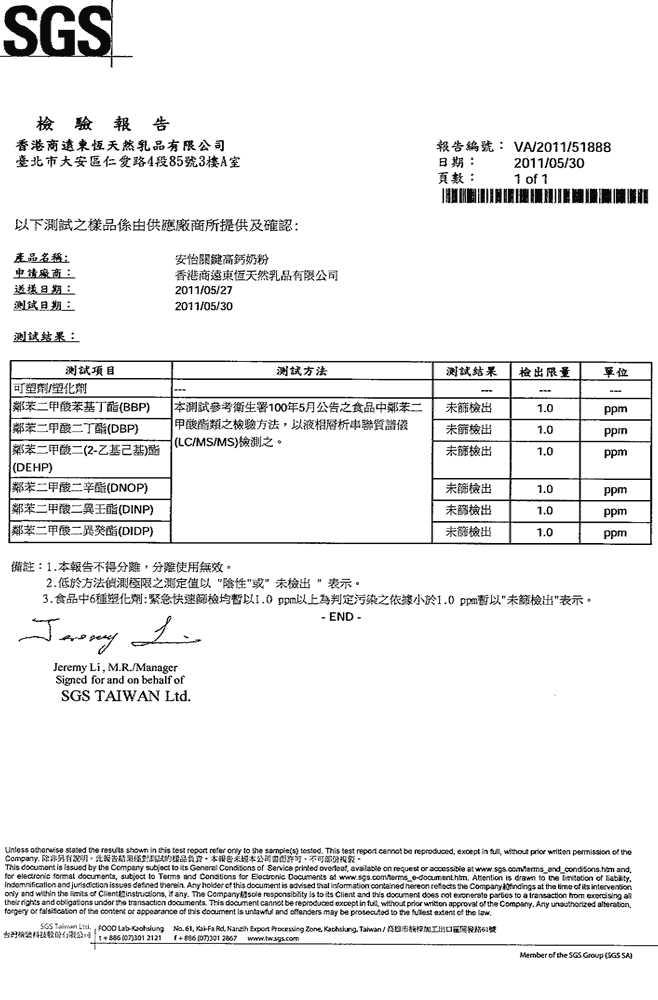 2.     為保障您的健康,安怡仍主動將本品牌所有產品送交SGS檢驗,且已通過SGS檢驗證實未含塑化劑(全品項檢驗報告如下),敬請安心。